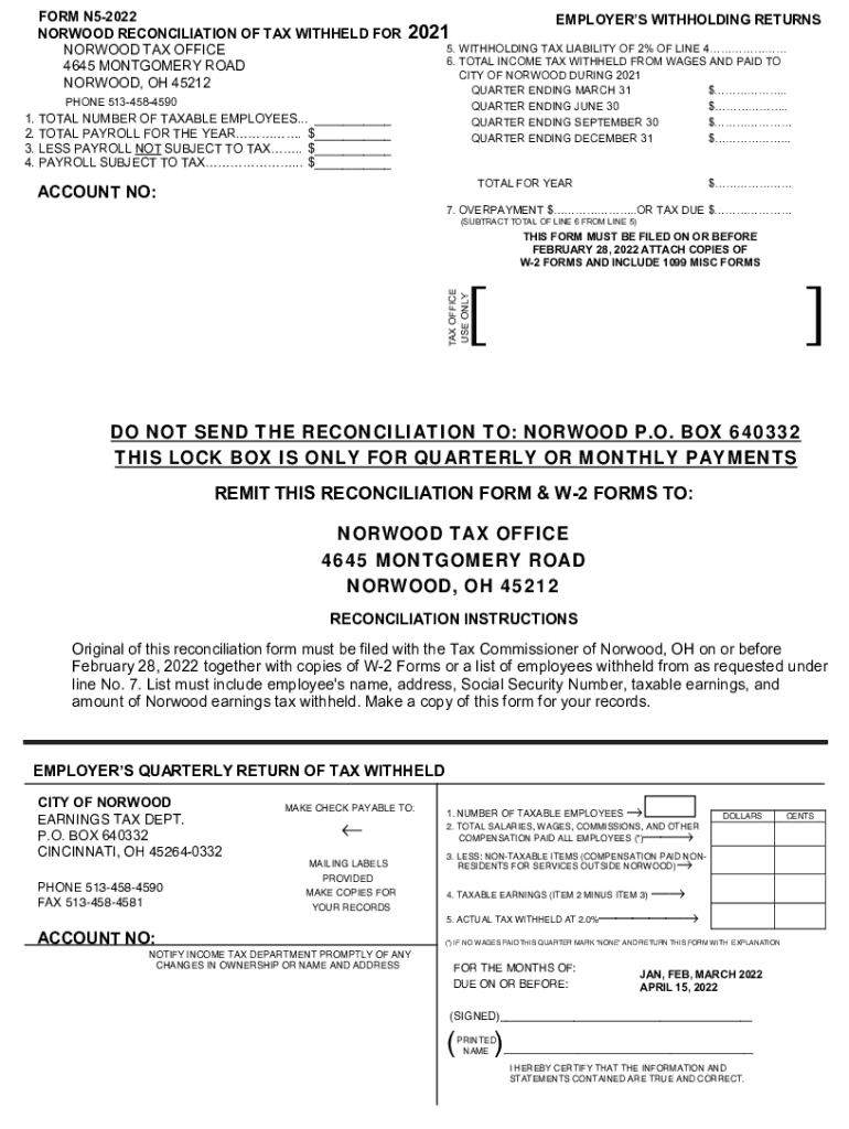 FORM N52022 EMPLOYERS WITHHOLDING RETURNS NORWOOD RECONCILIATION OF TAX WITHHELD FOR2021 :,7++2/\',1×$7;/, $%, /,72)2)/,1(125:22\'$7;2)), &($727/,1&20($7;:,7++(/\')520:$*($61\'$3,\'72 0217×20($552\'