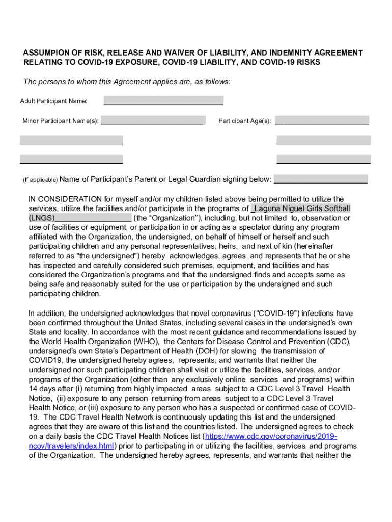 ASSUMPTION OF RISK, RELEASE AND WAIVER OF LIABILITY, AND INDEMNITY AGREEMENT RELATING TO COVID-19 EXPOSURE, COVID-19 LIABILITY, AND COVID-19 RISKS The persons to whom this Agreement applies are, as