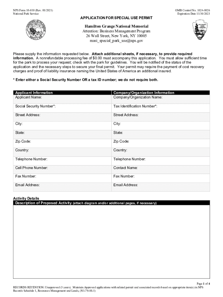 NPS Form 10930 (Rev. 08/2021) National Park Service OMB Control No. 10240026 Expiration Date 11/30/2023APPLICATION FOR SPECIAL USE PERMIT Hamilton Grange National Memorial Attention: Business Management