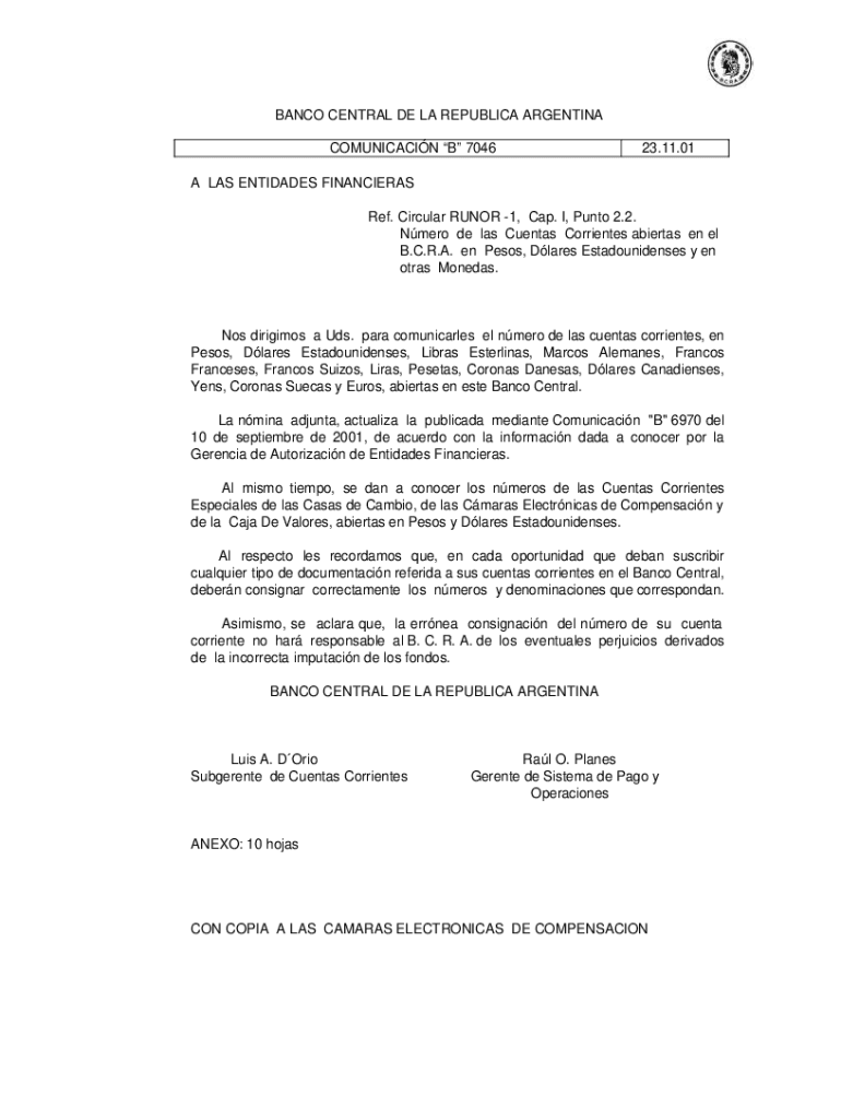 BANCO CENTRAL DE LA REPUBLICAN ARGENTINA COMMUNICATION B 704623.11.01A LAS ENFILADES FINANCIERS Ref. Circular RUMOR 1, Cap. I, Punt 2.2. Nero de leis Cents Oriented bears' en el B.C.R.A. en Pesos,
