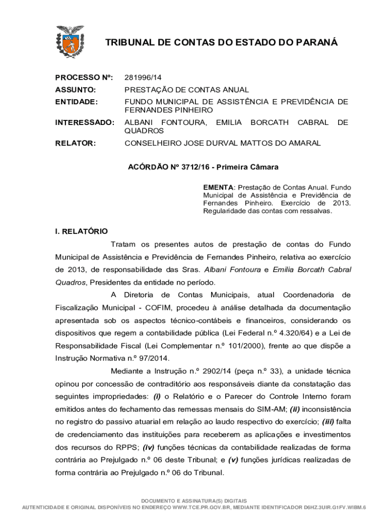 TRIBUNAL DE CONGAS DO ESTATE DO PARANPROCESSO N:281996/14ASSUNTO:PRESTO DE CONGAS ANUALENTIDADE:FUNDS MUNICIPAL DE ASSISTANCE E PROVINCIAL DE FERNANDES PINHEIROINTERESSADO:ALBANIA CONTOUR, QUADROSRELATOR:CONSELHEIRO