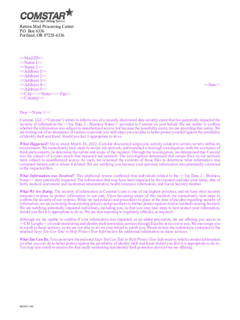 Get the free Exhibit 1 - Comstar, LLC - Notice of Data Event - CA - oag ca