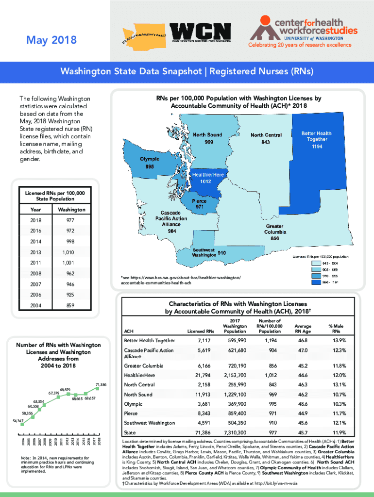May 2018 Washington State Data Snapshot | Registered Nurses (RN's) RN's per 100,000 Population with Washington Licenses by Accountable Community of Health (ACH)* 2018The following Washington statistics