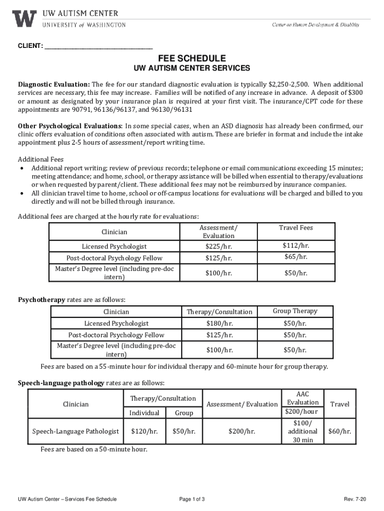 CLIENT: ___FEE SCHEDULE UW AUTISM CENTER SERVICES Diagnostic Evaluation: The fee for our standard diagnostic evaluation is typically $2,2502,500. When additional services are necessary, this fee may