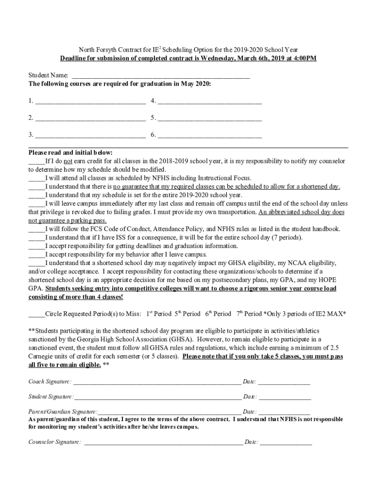 North Forsyth Contract for IE2 Scheduling Option for the 20192020 School Year Deadline for submission of completed contract is Wednesday, March 6th, 2019 at 4:00PM Student Name: ___ The following