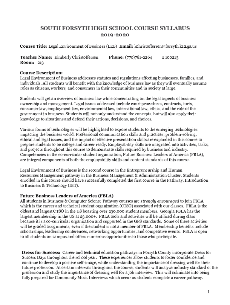 SOUTH FORSYTH HIGH SCHOOL COURSE SYLLABUS 20192020 Course Title: Legal Environment of Business (LEB) Email: kchristoffersen@forsyth.k12.ga.us Teacher Name: Kimberly Christoffersen Room: 213Phone: