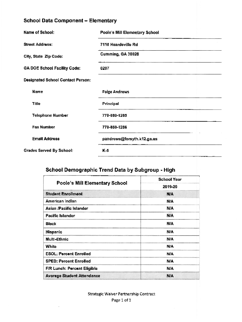 Name of School:Big Creek Elementary SchoolStreet Address:1994 Peach tree ParkwayCity, State Zip Code:Cumming, GA 30041GA DOE School Facility Code:1050Designated School