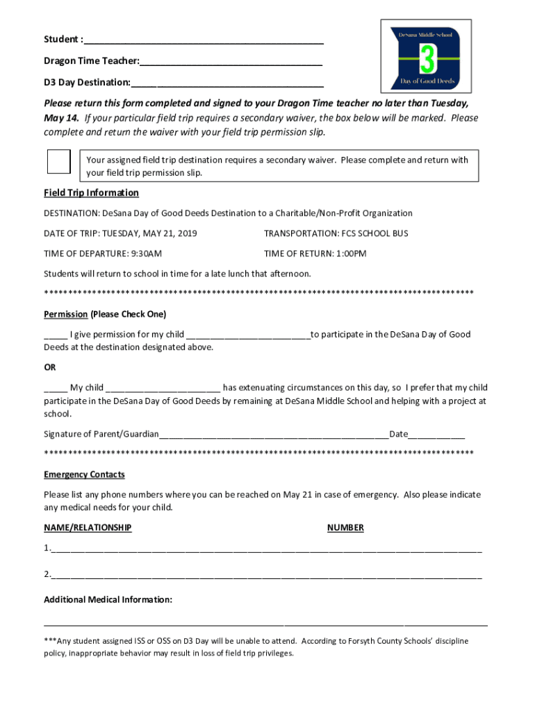 Student :___ Dragon Time Teacher:___ D3 Day Destination:___ Please return this form completed and signed to your Dragon Time teacher no later than Tuesday, May 14. If your particular field trip requires