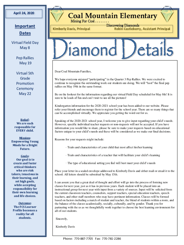 Coal Mountain Elementary April 24, 2020Important Determining For Coal. . . . . . . . Discovering Diamonds Kimberly Davis, Principal Robin Castle berry, Assistant PrincipalVirtual Field Day May 8 Pep