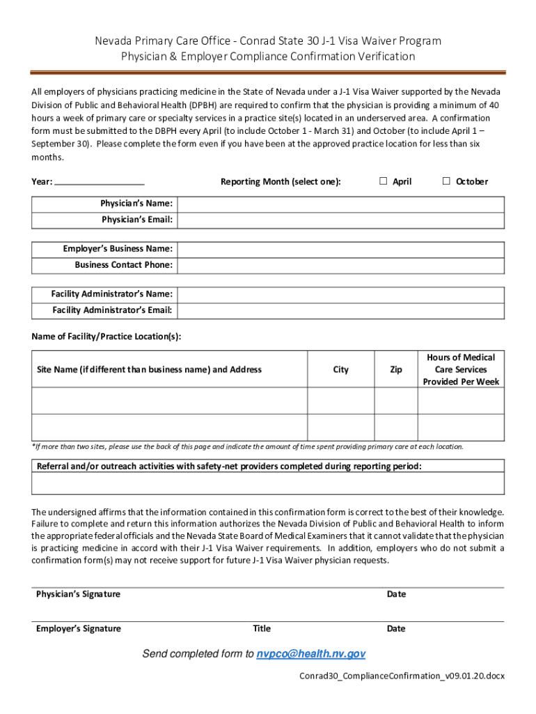Nevada Primary Care Office Conrad State 30 J1 Visa Waiver Program Physician & Employer Compliance Confirmation Verification All employers of physicians practicing medicine in the State of Nevada under