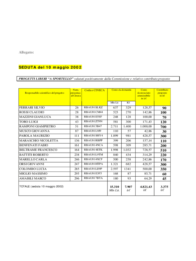 Allegato:SEDUCE Del 10 Maggie 2002 PROGESTIN LIBERIA A PORTILLO valuate positivamente Dallas Commission e relative contribute propostoResponsabile scientific Del progettoNum. Present. Al CinecaCodice