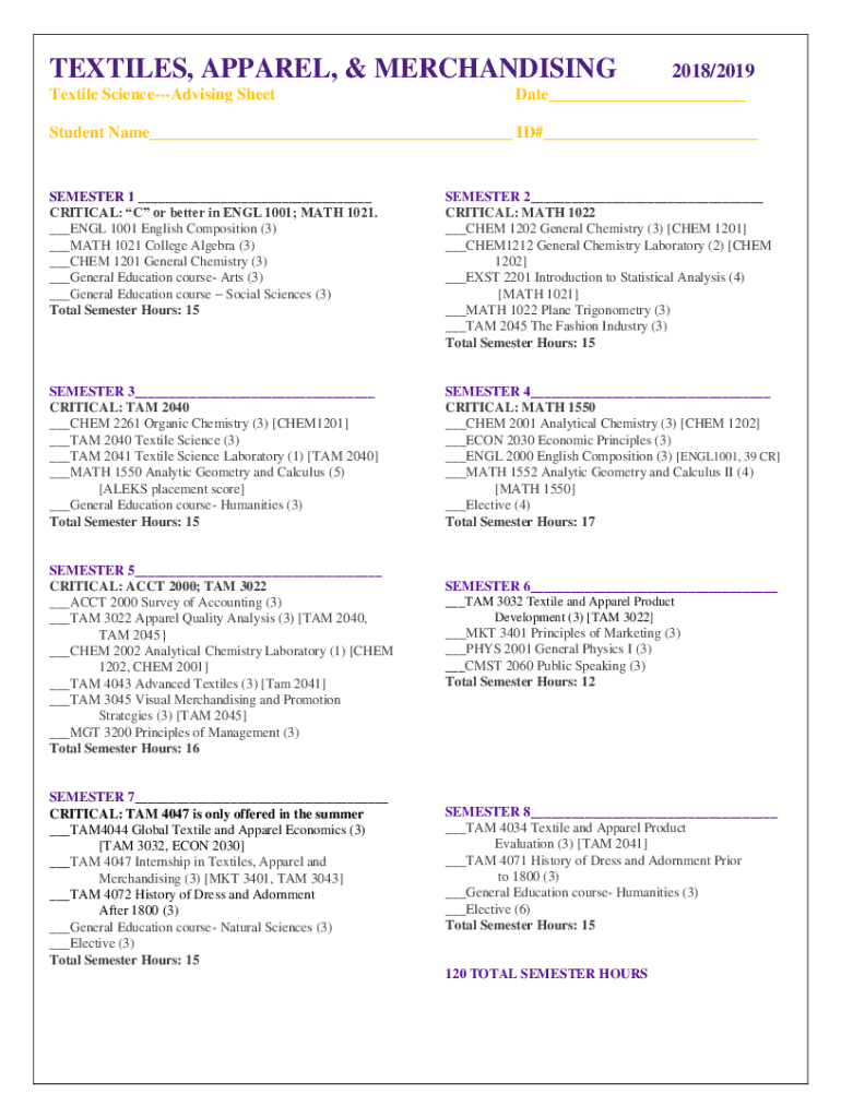 TEXTILES, APPAREL, & MERCHANDISING Textile ScienceAdvising Sheet2018/2019Date___Student Name___ ID#___SEMESTER 1 ___ CRITICAL: C or better in EGL 1001; MATH 1021. ___EGL 1001 English Composition (3)