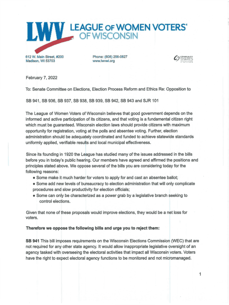 I luff LEAGUE of WOMEN VOTERS OF WISCONSIN 612 W. Main Street, #200 Madison, We 53703Phone: (608) 2560827 www.lwvwi.orgA *February 7, 2022, To: Senate Committee on Elections, Election Process Reform