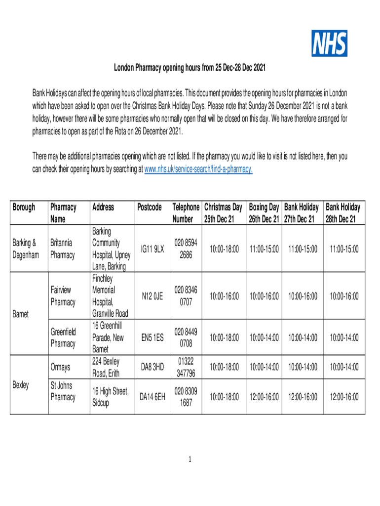 London Pharmacy opening hours from 25 Dec28 Dec 2021 Bank Holidays can affect the opening hours of local pharmacies. This document provides the opening hours for pharmacies in London which have been