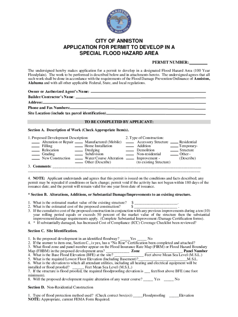 CITY OF ANNISTON APPLICATION FOR PERMIT Developing IN A SPECIAL FLOOD HAZARD AREA PERMIT NUMBER:___ The undersigned hereby makes application for a permit to develop in a designated Flood Hazard Area