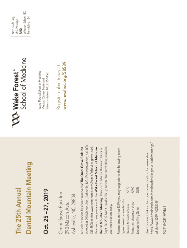 102419NORTHWESTUse this direct link or the code below if calling for reservation. https://www.omnihotels.com/hotels/ashevillegrovepark/meetings/ wfdental201910242019Room rates start at $339; you may