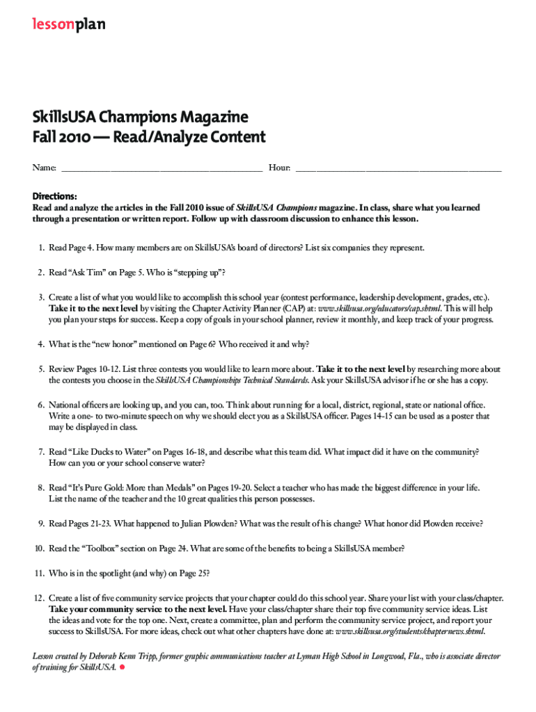 LessonplanSkillsUSA Champions Magazine Fall 2010 Read/Analyze Content Name: ___ Hour: ___Directions:Read and analyze the articles in the Fall 2010 issue of Skills USA Champions magazine. In class,