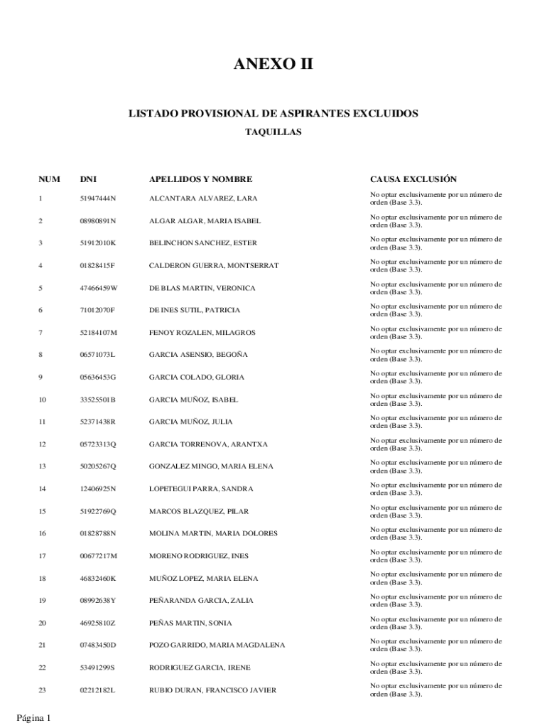 TAQUILLASNUMDNIAPELLIDOS Y NOMBRECAUSA EXCLUSIN151947444NALCANTARA ALVAREZ, Latino op tar exclusivamente POR un Nero de