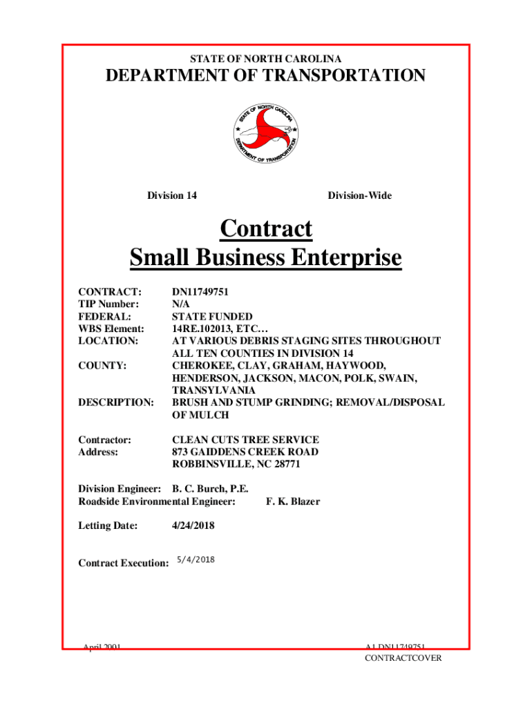 STATE OF NORTH CAROLINADEPARTMENT OF TRANSPORTATIONDivision 14DivisionWideContract Small Business Enterprise CONTRACT: TIP Number: FEDERAL: WBS Element: LOCATION: COUNTY:DESCRIPTION:Contractor: Address:DN11749751
