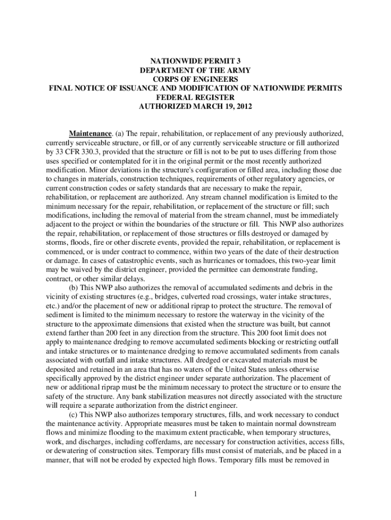Get the free NATIONWIDE PERMIT 3 DEPARTMENT OF THE ARMY CORPS OF ENGINEERS FINAL ...