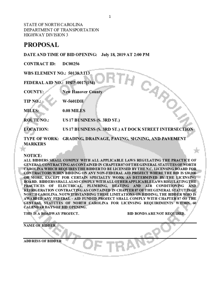 1STATE OF NORTH CAROLINA DEPARTMENT OF TRANSPORTATION HIGHWAY DIVISION 3PROPOSAL DATE AND TIME OF BID OPENING: July 18, 2019, AT 2:00 PM CONTRACT ID:DC00256WBS ELEMENT NO.: 50138.3.113 FEDERAL AID