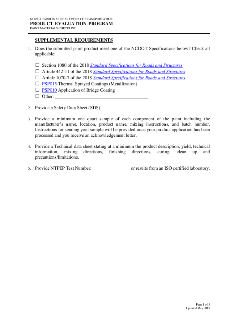 NORTH CAROLINA DEPARTMENT OF TRANSPORTATIONPRODUCT EVALUATION PROGRAM PAINT MATERIALS CHECKLISTSUPPLEMENTAL REQUIREMENTS 1. Does the submitted paint product meet one of the NC DOT Specifications below?