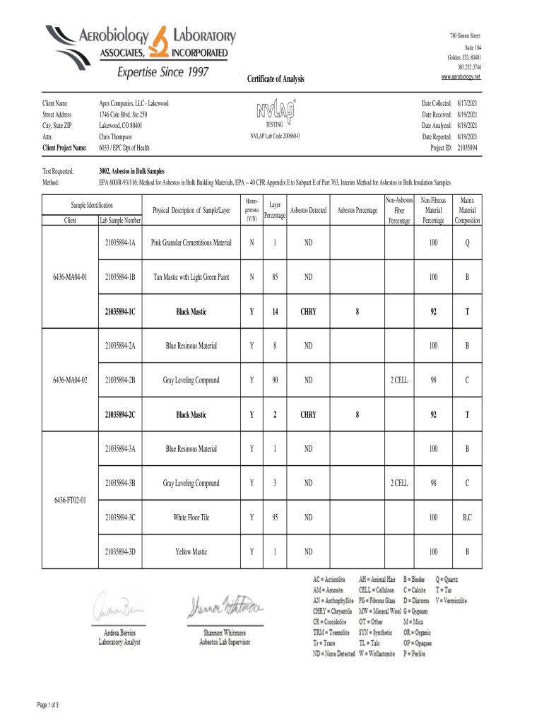 780 Sims Street Suite 104 Golden, CO, 80401 303.232.3746 www.aerobiology.netCertificate of Analysis Client Name Street Address City, State ZIP Attn: Client Project Name:Apex Companies, LLC Lakewood