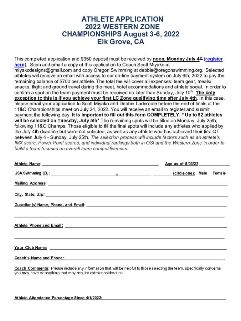 ATHLETE APPLICATION 2022 WESTERN ZONE CHAMPIONSHIPS August 36, 2022, Elk Grove, CA This completed application and $350 deposit must be received by noon, Monday, July 4th (register here). Scan and
