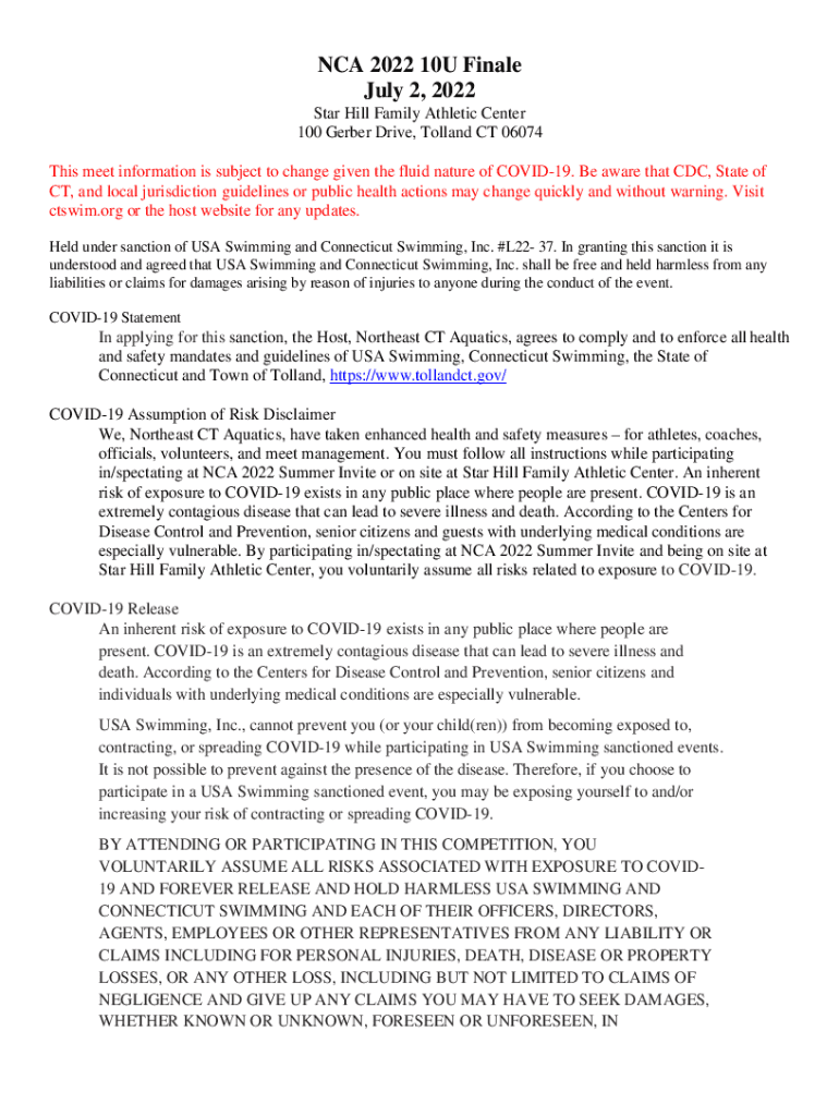 NCA 2022 10U Finale July 2, 2022-Star Hill Family Athletic Center 100 Gerber Drive, Holland CT 06074 This meet information is subject to change given the fluid nature of COVID-19. Be aware that CDC,