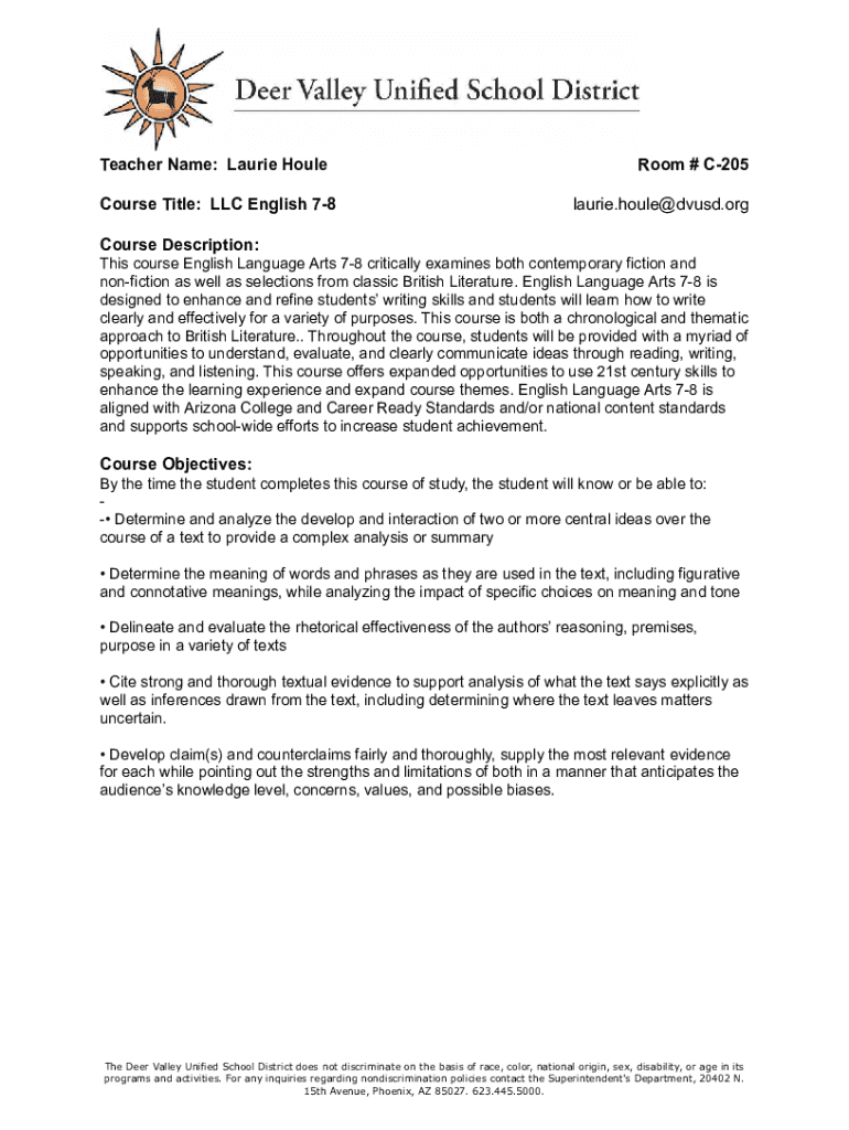 Teacher Name: Laurie House Course Title: LLC English 78Room # C205 laurie.houle@dvusd.orgCourse Description: This course English Language Arts 78 critically examines both contemporary fiction and