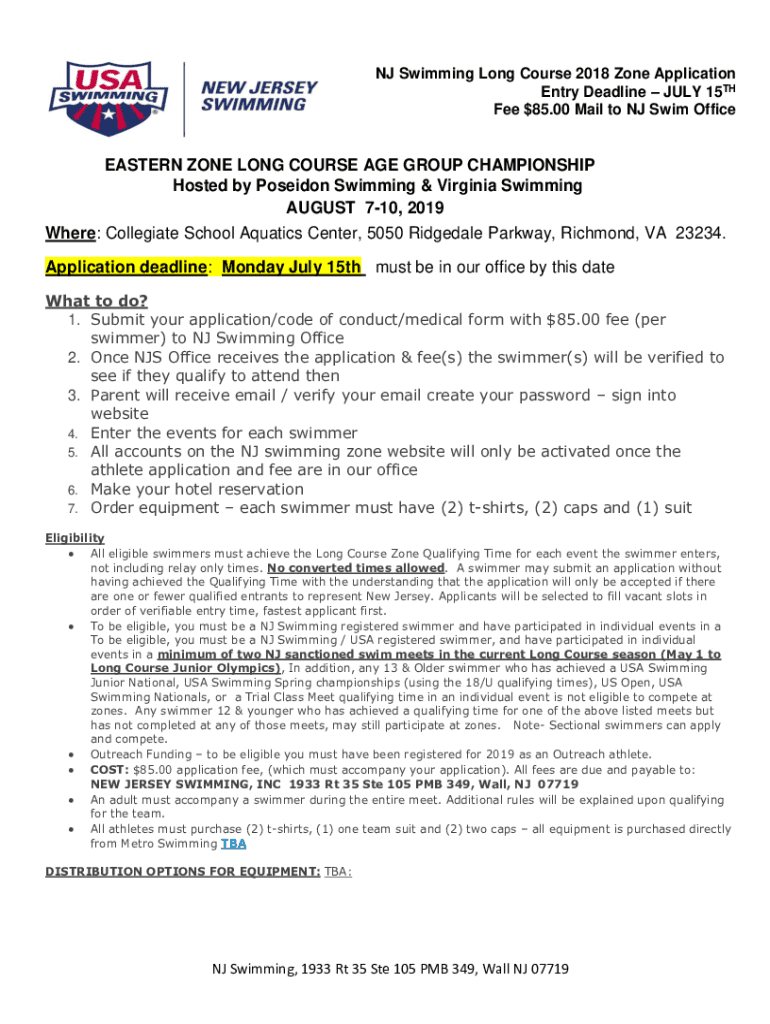 NJ Swimming Long Course 2018 Zone Application Entry Deadline JULY 15TH Fee $85.00 Mail to NJ Swim OfficeEASTERN ZONE LONG COURSE AGE GROUP CHAMPIONSHIP Hosted by Poseidon Swimming & Virginia Swimming