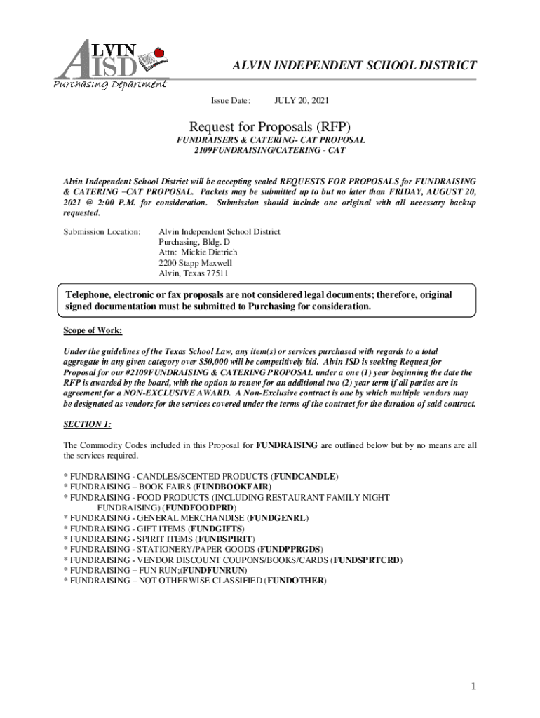 ALVIN INDEPENDENT SCHOOL DISTRICT Issue Date:JULY 20, 2021Request for Proposals (RFP) FUNDRAISERS & CATERING CAT PROPOSAL 2109FUNDRAISING/CATERING CAT Alvin Independent School District will be accepting
