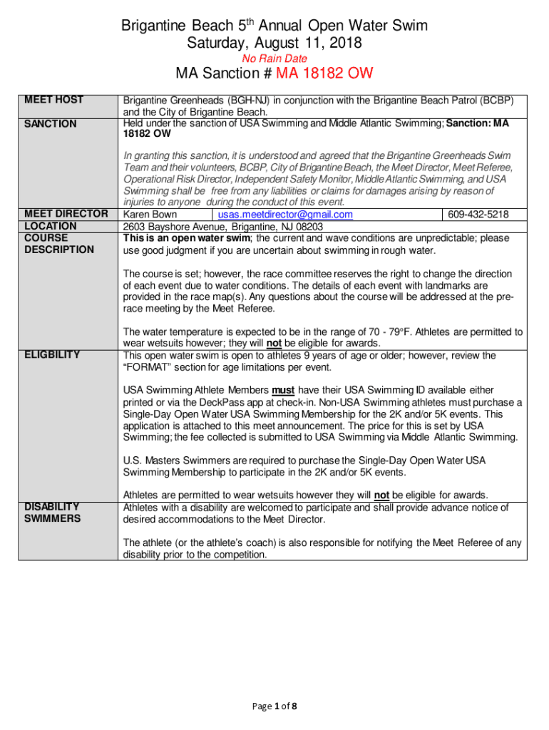 Brigantine Beach 5th Annual Open Water Swim Saturday, August 11, 2018, No Rain Date MA Sanction # MA 18182 OW MEET HOST SANCTIONED DIRECTOR LOCATION COURSE DESCRIPTIONBrigantine Green heads (BGH NJ)