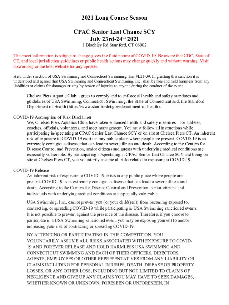 2021 Long Course Season CPA Senior Last Chance SAY July 23rd24th 2021 1 Blackly Rd Stamford, CT 06902This meet information is subject to change given the fluid nature of COVID-19. Be aware that CDC,