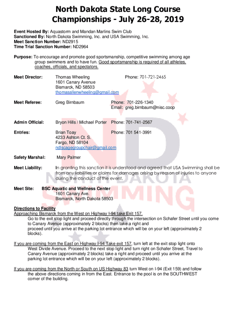 North Dakota State Long Course Championships July 2628, 2019 Event Hosted By: Aqua storm and Maidan Marlins Swim Club Sanctioned By: North Dakota Swimming, Inc. and USA Swimming, Inc. Meet Sanction