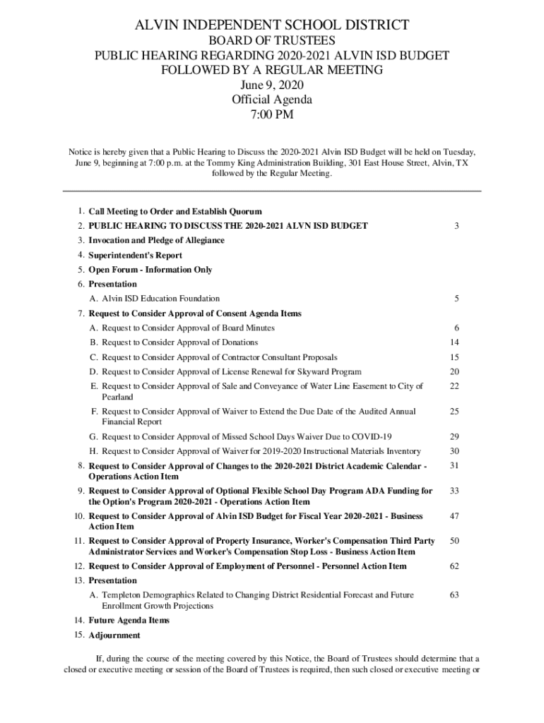 ALVIN INDEPENDENT SCHOOL DISTRICT BOARD OF TRUSTEES PUBLIC HEARING REGARDING 20202021 ALVIN ISD BUDGET FOLLOWED BY A REGULAR MEETING June 9, 2020, Official Agenda 7:00 PM Notice is hereby given that