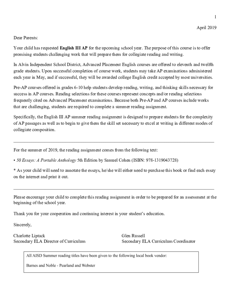 Get the free AP English III Summer Reading Assignment - Alvin ISD