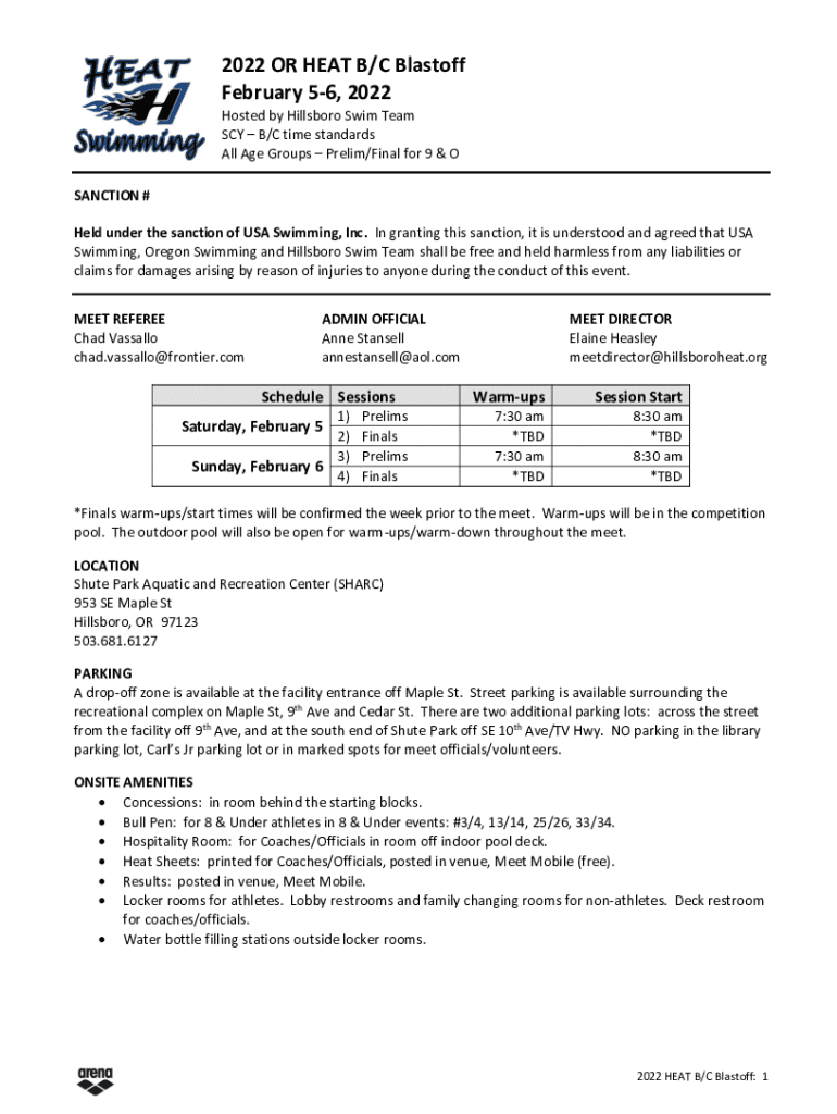 2022 OR HEAT B/C Blastoff February 56, 2022 Hosted by Hillsboro Swim Team SAY B/C time standards All Age Groups Prelim/Final for 9 & O SANCTION # Held under the sanction of USA Swimming, Inc. In granting