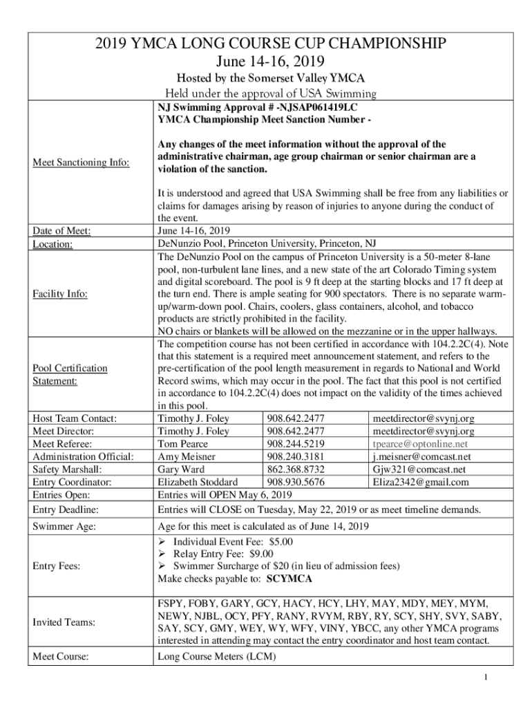 2019 YMCA LONG COURSE CUP CHAMPIONSHIP June 1416, 2019 Hosted by the Somerset Valley YMCA Held under the approval of USA Swimming NJ Swimming Approval # NJSAP061419LC YMCA Championship Meet Sanction