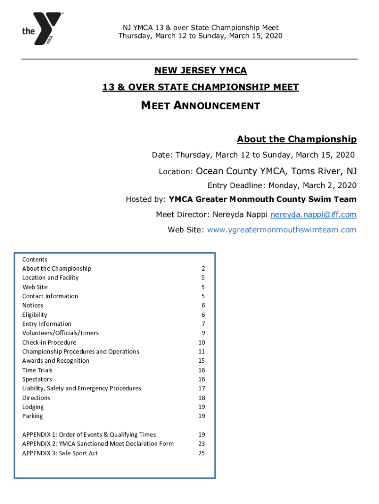 NJ YMCA 13 & over State Championship Meet Thursday, March 12 to Sunday, March 15, 2020NEW JERSEY YMCA 13 & OVER STATE CHAMPIONSHIP VESTMENT ANNOUNCEMENT About the Championship Date: Thursday, March
