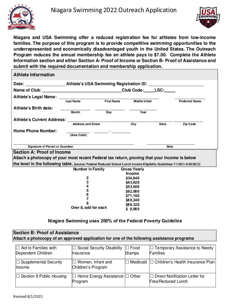 Niagara Swimming 2022 Outreach Application Niagara and USA Swimming offer a reduced registration fee for athletes from low income families. The purpose of this program is to provide competitive swimming
