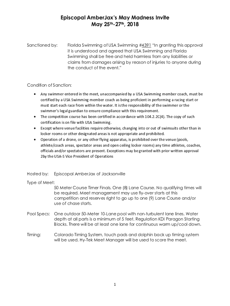 Episcopal Ambergris May Madness Invite May 25th27th, 2018Sanctioned by:Florida Swimming of USA Swimming #4391 In granting this approval it is understood and agreed that USA Swimming and Florida Swimming