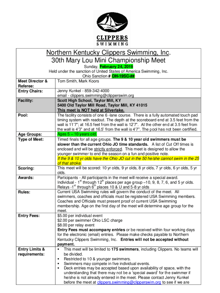 Northern Kentucky Clippers Swimming, Inc. 30th Mary Lou Mini Championship Meet Sunday, February 24, 2019, Held under the sanction of the United States of America Swimming, Inc. Ohio Sanction # OH19SC##