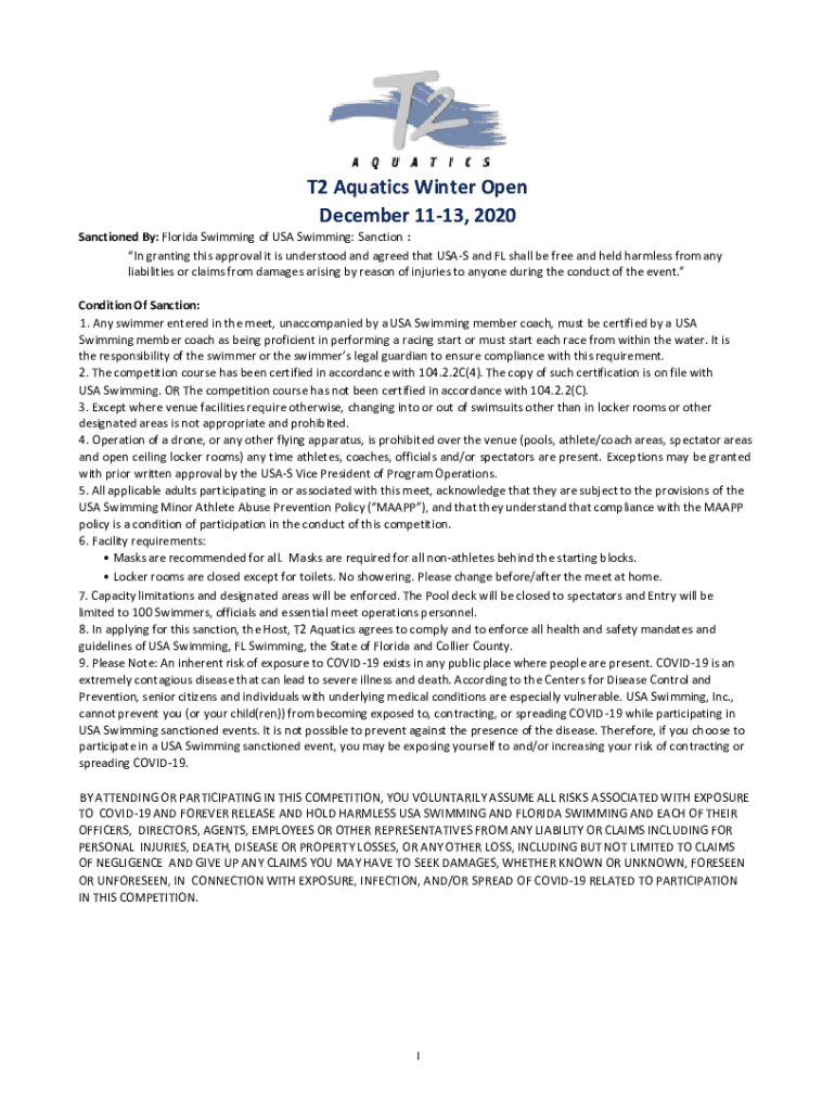 T2 Aquatics Winter Open December 1113, 2020 Sanctioned By: Florida Swimming of USA Swimming: Sanction : In granting this approval it is understood and agreed that USES and FL shall be free and held