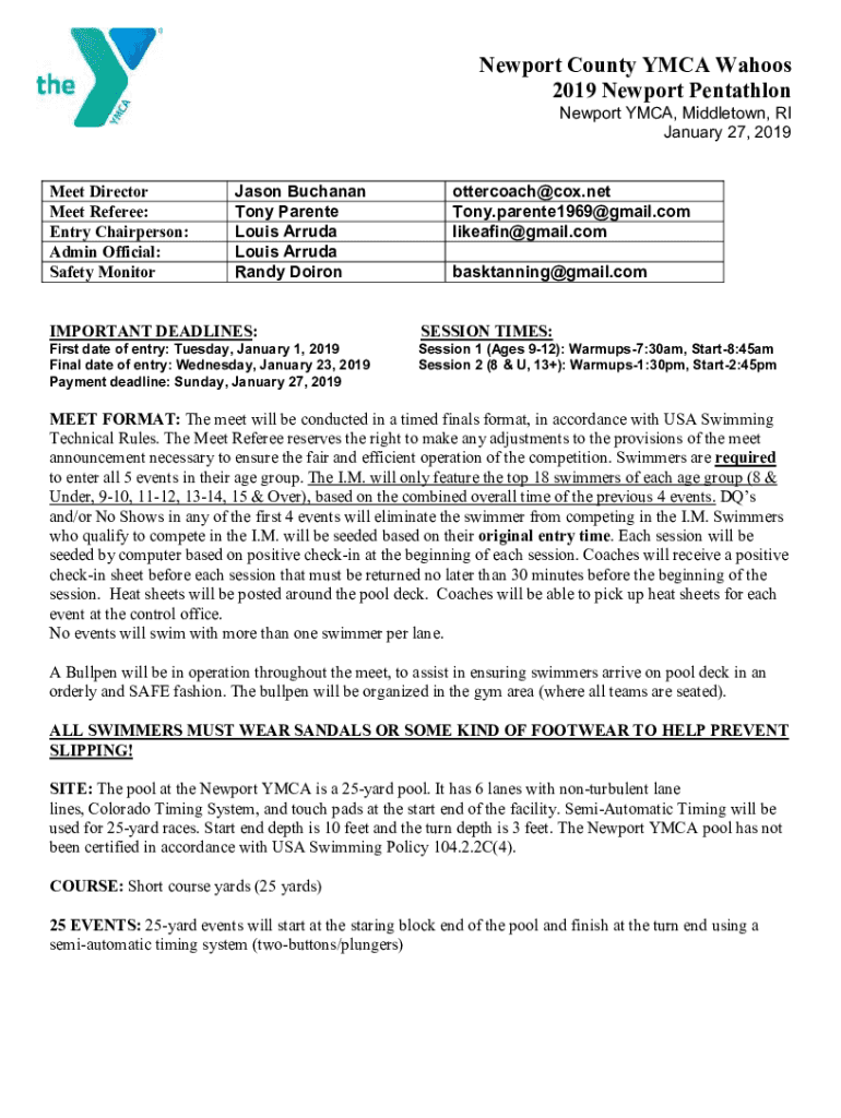 Newport County YMCA Yahoos 2019 Newport Pentathlon Newport YMCA, Middletown, RI January 27, 2019Meet Director Meet Referee: Entry Chairperson: Admin Official: Safety Monitor Jason Buchanan Tony Parents