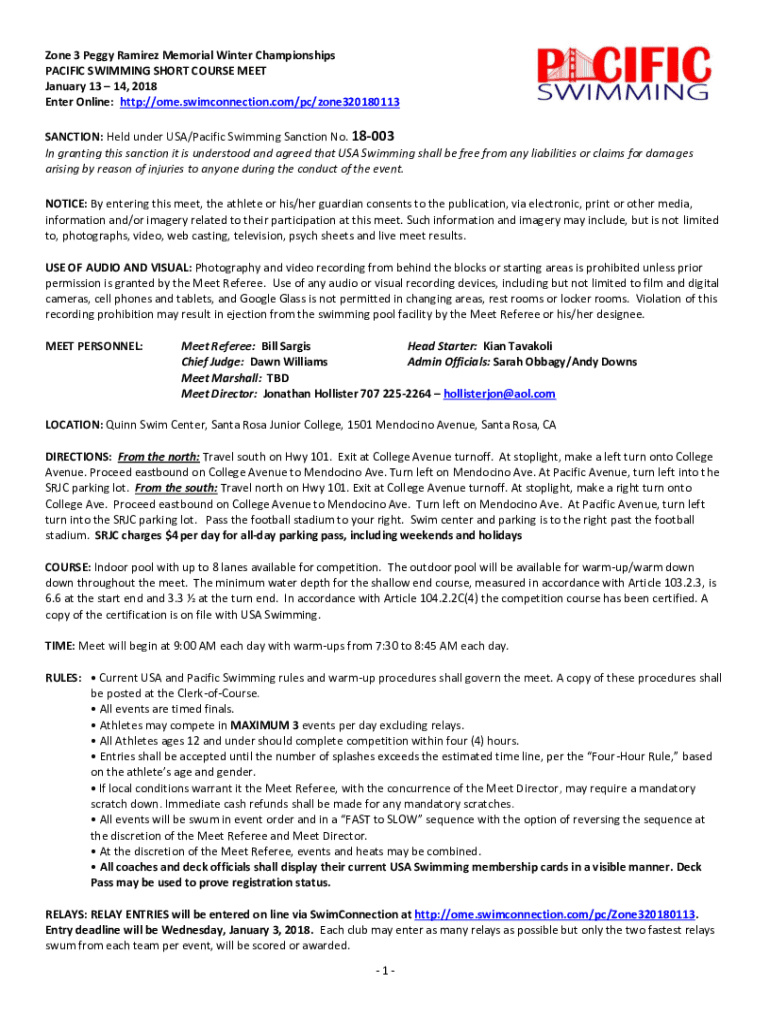 Zone 3 Peggy Ramirez Memorial Winter Championships PACIFIC SWIMMING SHORT COURSE MEET January 13 14, 2018 Enter Online: http://ome.swimconnection.com/pc/zone320180113 SANCTION: Held under the USA/Pacific