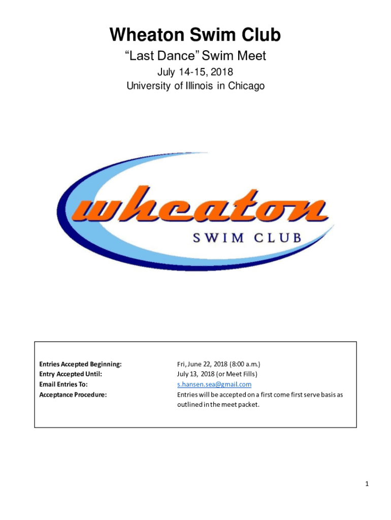 Wheaton Swim Club Last Dance Swim Meet July 1415, 2018 University of Illinois in ChicagoEntries Accepted Beginning: Entry Accepted Until: Email Entries To: Acceptance Procedure:Fri, June 22, 2018