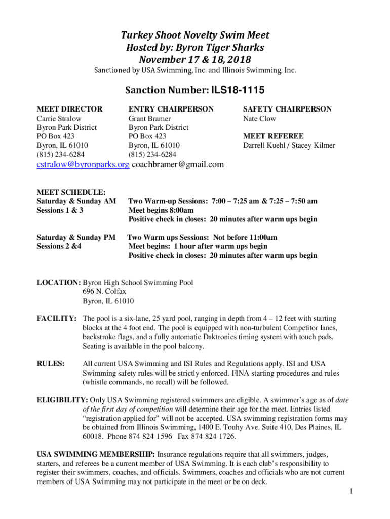 Turkey Shoot Novelty Swim Meet Hosted by: Byron Tiger Sharks November 17 & 18, 2018Sanctioned by USA Swimming, Inc. and Illinois Swimming, Inc. Sanction Number: ILS181115MEET DIRECTOR Carrie Straw