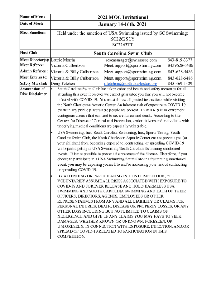 Name of Meet:2022 MOC Invitational January 1416th, 2021Date of Meet: Meet Sanction:Held under the sanction of USA Swimming issued by SC Swimming: SC2262SCY SC2263TTHost Club: Meet Director(s): Meet