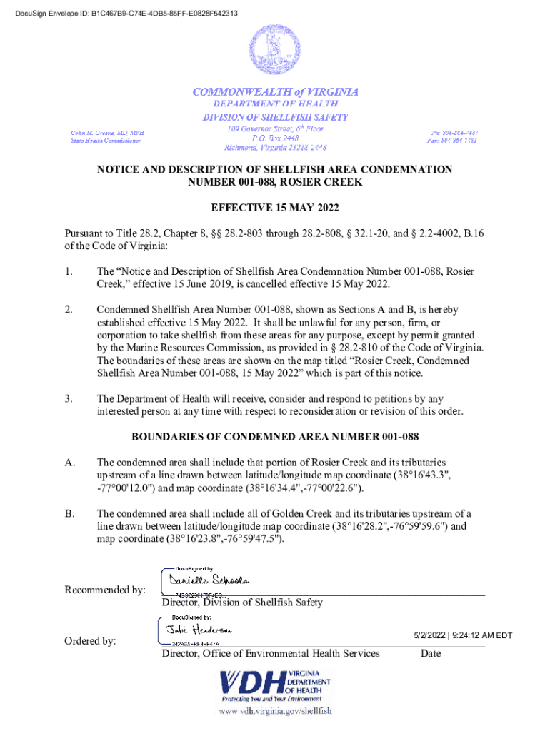 DocuSign Envelope ID: B1C467B9C74E4DB585FFE0828F542313NOTICE AND DESCRIPTION OF SHELLFISH AREA CONDEMNATION NUMBER 001088, ROSIER CREEK EFFECTIVE 15 MAY 2022 Pursuant to Title 28.2, Chapter 8, 28.2803